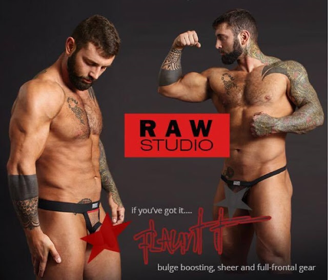 Velasquez explains that, "There are two looks. Raw Studio is for the gay man of any age who has their sexuality under control, they know who they are. They're confident and they want products that make them feel that way. And make them look good. Buster is more of a sports casual, not so fetishy, not so sexually charged. More practical, more cotton-based, something you can wear on a daily basis. Raw Studio is racy and sexy, Buster is comfort casual."Comfort is crucial for Velasquez. "I'm usually inspired by the fabric. Predominantly I use European fabrics, micro-fibres, laser-cut out fabrics. It's about the tactile quality. I figure if it's something that close to your body, it really should feel nice. Once I have it, I start playing around and trying different things. I try to design something that is comfortable to wear and feels good when it's on. Especially some of the kinky wear, you want it to fit a certain way and have that look but at the same time there's nothing worse than wearing something that feels uncomfortable. It's owning that piece and that piece owning you. When I'm creating the first design, the prototype, I'm the first person wearing it. Do I like it? I run it through the test of wearing it all day long. If it feels great and comfortable, it has my approval. If it doesn't perform the way I want it to perform, I scrap it and start all over again. I am my own best customer."